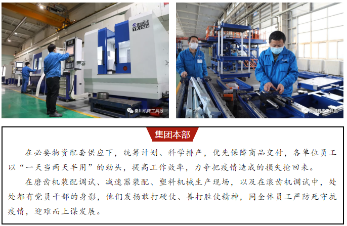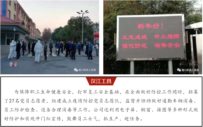 打赢疫情防控阻击战硬仗,打好生产经营攻坚战胜仗。 2月10日以来,秦川集团各企业陆续复工。 10日,集团本部、宝鸡机床及秦川格兰德复工,复工率分别达到75%、82%、92%。 11日,汉江工具、汉江机床进入工作状态,复工率分别为50%、51%。